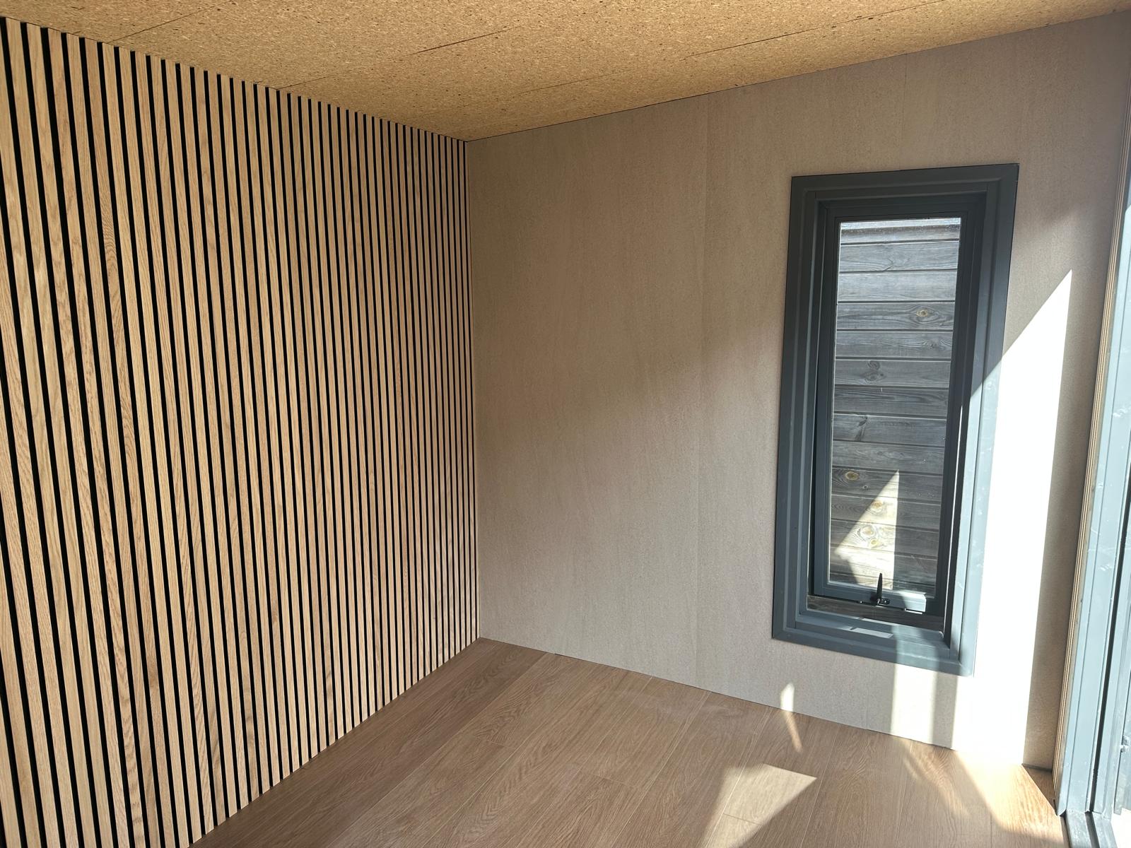 This job was slightly different from the usual bathroom installations, as the panels were fitted inside a garden room that had been converted into a home gym. The customer wanted something plain and neutral that would complement the existing wood-effect panels already installed in the space.