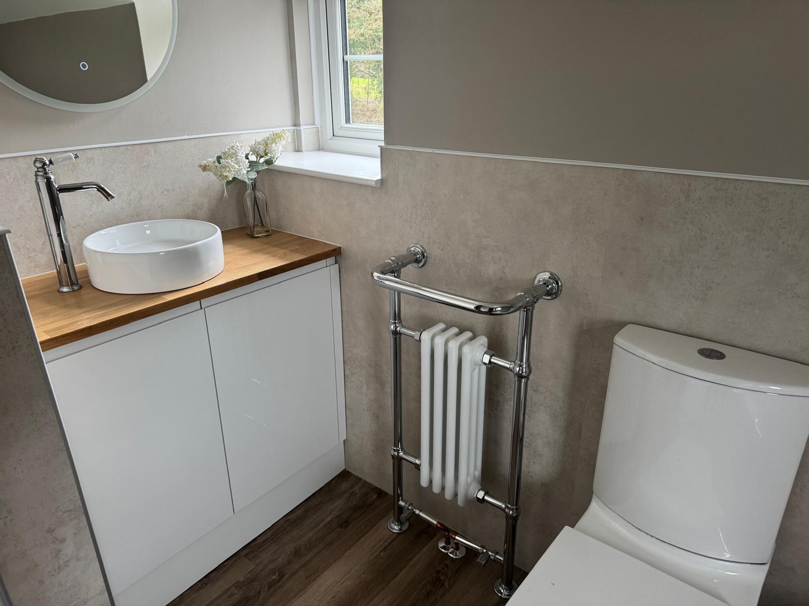It was Mrs Marsh’s decision to go for a framed design, installing the panels at half the height of the bathroom walls rather than using full-length panels. This design choice added character while keeping the space feeling open and balanced.